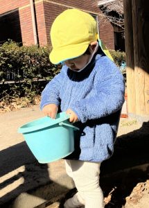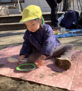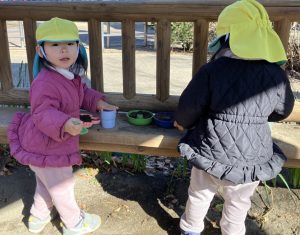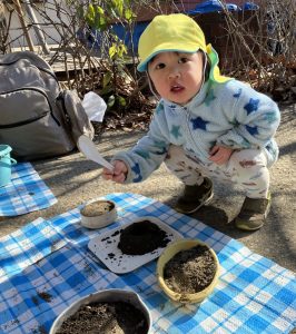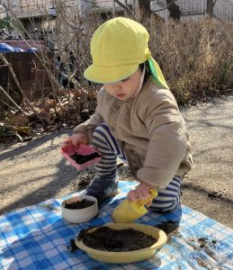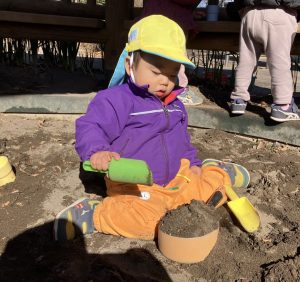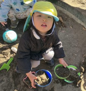 砂場では「ブタのおにくごはん」「トマトジュース」「ケーキ」「カレー」「チャーハン」と思い思いに料理をしたり、鍋やお皿に砂を入れては出してと繰り返し遊ぶのを楽しむ姿がありました☺