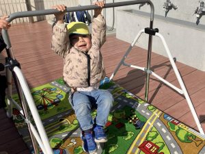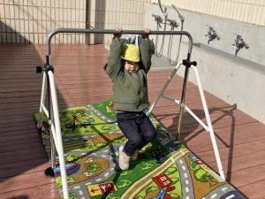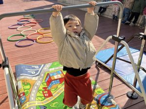 鉄棒はみんなで1から10まで数えました。お友だちの応援も10まで数えることも楽しみの一つだったようです。手全体で握る力、足を上げる力がついてきています✨