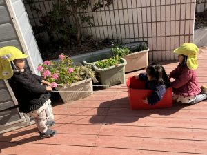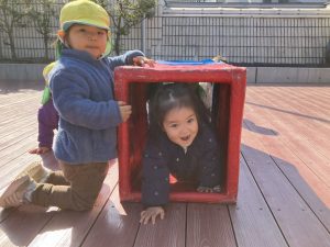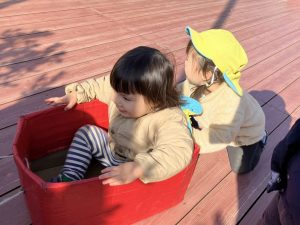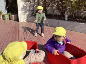 段ボール電車では乗ることだけでなくお友だちを引っ張ることも楽しみました。「しゅっしゅっ」と電車になりきったり、「○○にいきまーす」と案内していたり。イメージをもってあそぶ姿がありました!