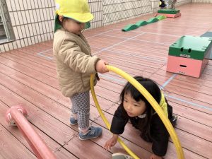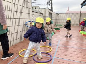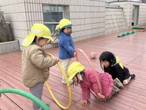 自然とフープをサーキットにつなげ、トンネルを作る子の姿も。お友だちと関わりながら遊ぶことが楽しくなっていますね!
