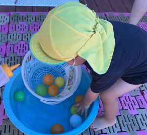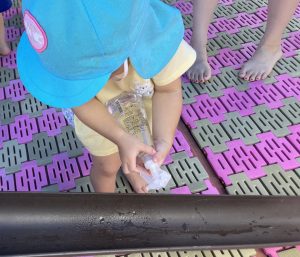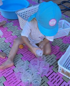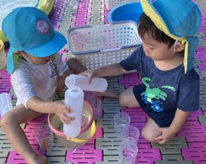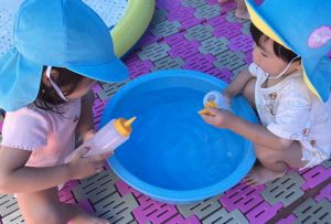 容器に水を入れたら、自分でふたをして細く出てくる水を楽しんだり、ふたに水を流し入れてみたり、ボトル部分を使って水を移し替えたりして楽しんでいました。コップをたくさん並べて、「ジュース屋さんです!」と言って、お店を開くお友だちや「ジュース持ってきた!」と言ってジュースを運んでくるお友だちもいました。