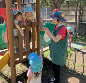今日は子どもたち自身が遊びたい場所を選んで、グラウンドとウッドデッキに分かれて過ごしました。