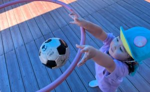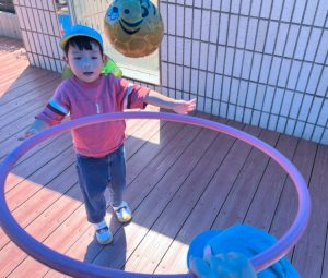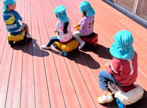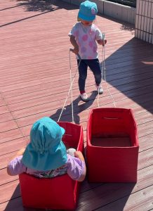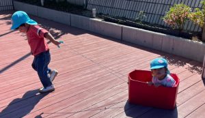 ウッドデッキでは、段ボール電車やコンビカー、ボールなどを使ってたくさん体を動かしました。