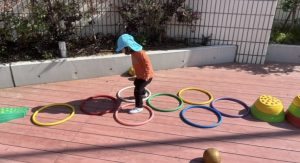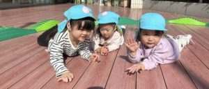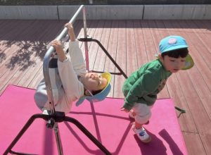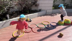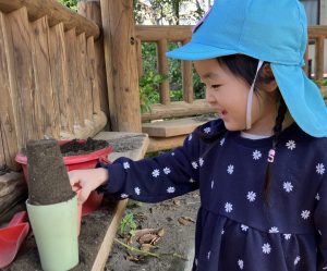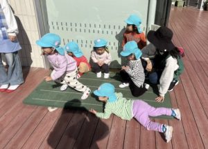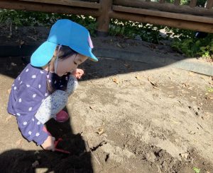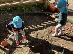 今日はお砂場とデッキに分かれました。子ども達が好きな場所を選んで遊んでいます。お砂場はなんと2人!のびのびとじっくり、おままごとをしたりどんぐりの道を作ったりして遊べたようです。デッキでは、サーキットを楽しんだり、ワニやおばけに変身しイメージを合わせながら追いかけっこをしたりして遊びました。