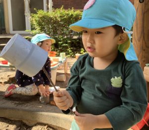 2025たんぽぽ今日はお砂場とデッキに分かれました。子ども達が好きな場所を選んで遊んでいます。お砂場はなんと2人!のびのびとじっくり、おままごとをしたりどんぐりの道を作ったりして遊べたようです。デッキでは、サーキットを楽しんだり、ワニやおばけに変身しイメージを合わせながら追いかけっこをしたりして遊びました。