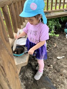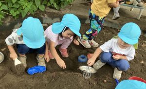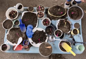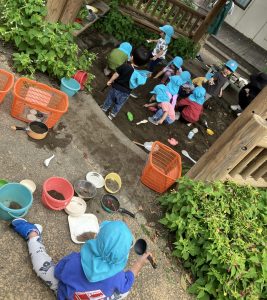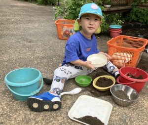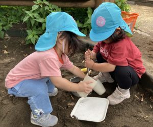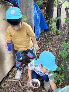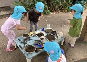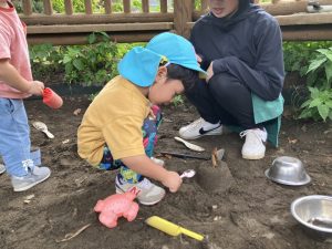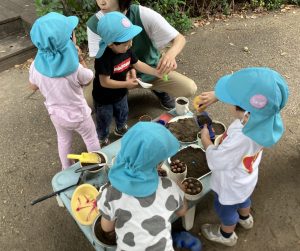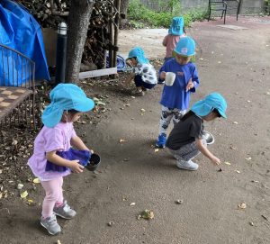 今日はみんなでお砂場へ行きました。毎日たくさんのどんぐりが落ちている時期なので、今日はどんぐりを使いたいお友だちは拾いに行きました。他にもおしろい花や種など、秋の素材を使いながら遊ぶ姿がありました。