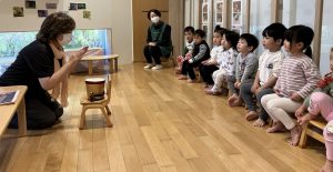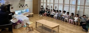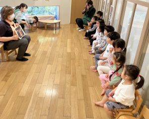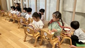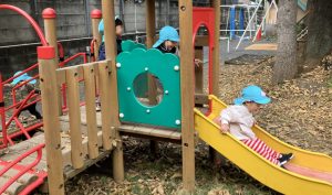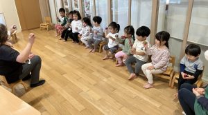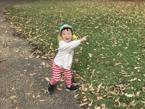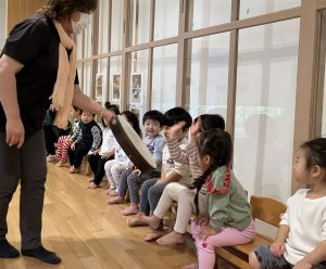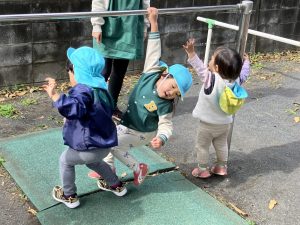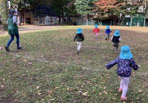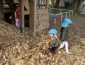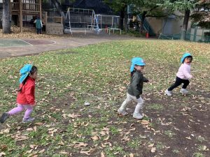 今日は桃原先生による音楽あそびがありました。小太鼓やたまごマラカスを歌詞のリズムや拍節に合わせて鳴らしてみたり、お歌を歌ったりました。その後はグラウンドへ。グラウンドではかけっこやしっぽとりをしたり、落ち葉を投げ合って遊んだり、かくれんぼをしたり。お友だちとやりとりをしながら遊んでいます。