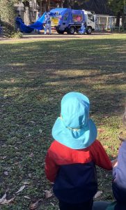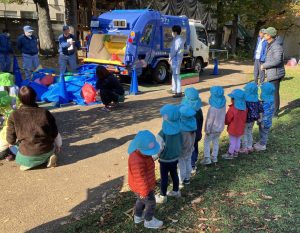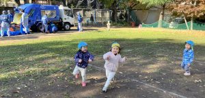 今日はグラウンドへ行きました。幼児クラス(主にひまわり組)向けにゴミ収集の体験ができるゴミ収集車(カティ君)がグラウンドに来ていました。たんぽぽ組の子どもたちもその様子を一緒に見せてもらいました。目の前で動く様子に釘付け!真剣な表情でしたよ。後半はしっぽとりや、園長先生との追いかけっこを楽しんで体を動かしています。