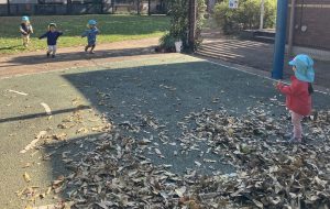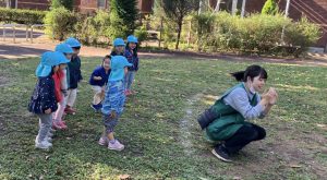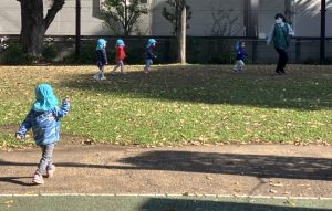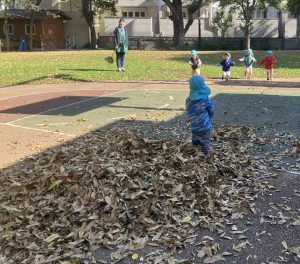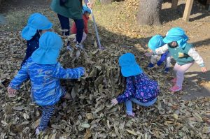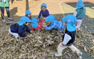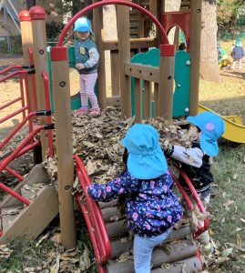今日はグラウンドへ行きました。だるまさんが転んだやしっぽとりゲームをしたり、たくさんの落ち葉を使ってお山を作ったり、ツリーハウスに集めて葉っぱのお家を作ったりして遊びました。