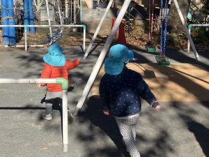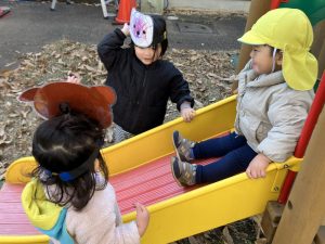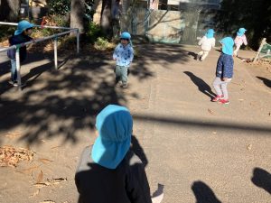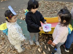 すみれ組のクマのお面を借りると、「クマのお家です!どうぞ~!」とすみれ組のお友だちに声を掛けたり、恐竜になりきって追いかけっこをしたり、ボールで遊んだりしました♪