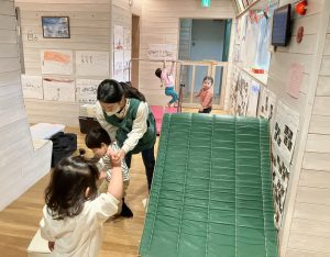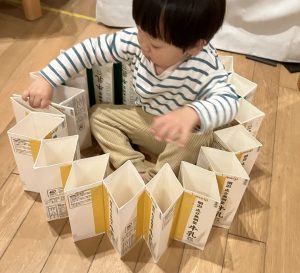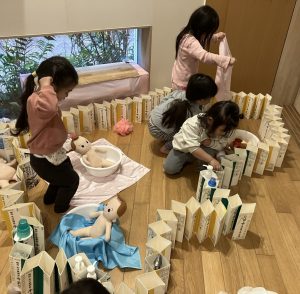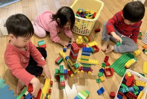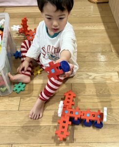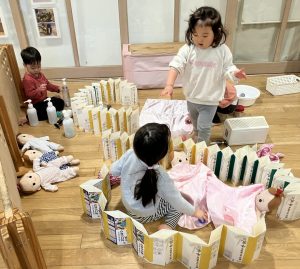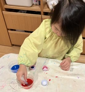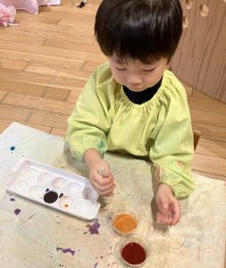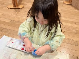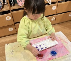お部屋でブロックや、スポイトで色水遊びをしたり、廊下で体を動かしたりして遊びました。色水遊びでは、赤と青と黄色の色水を混ぜて遊びました。後半は、お風呂ごっこもしました。