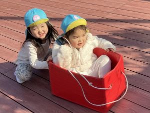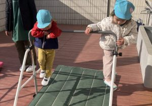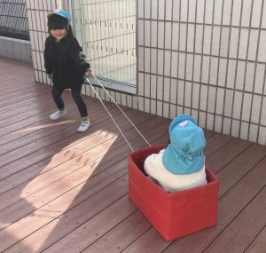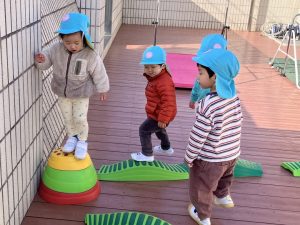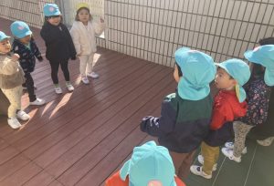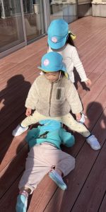 今日は、ウッドデッキで遊びました。最初は全員で『3匹のこぶた』で遊びました。一緒に歌を歌いながら、「次は木の家だ!」とおおかみに食べられないように逃げる子どもたち。レンガの家でお家が壊れれず、おおかみががっかりしていると、「やったー!」と大喜びしていました😊二回目からは、子どもたちもおおかみ役とこぶた役に分かれて遊びました。後半は、段ボール列車や鉄棒、一本橋で遊びました♪