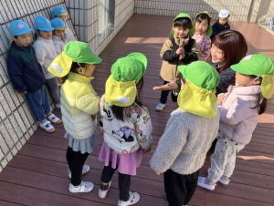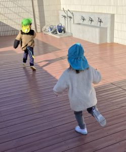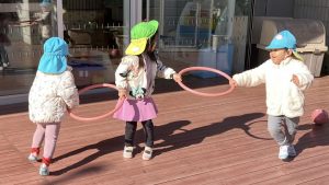 ウッドデッキでは、最初にみんなで自己紹介をして、しっぽとりやフープ、ボールで遊びました。
