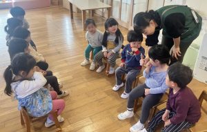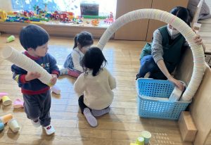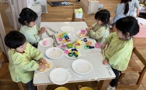 お部屋では米粉粘土やおままごと、紙コップ遊びなどのコーナーで好きな遊びを楽しむ中で関わりを楽しむ姿がありましたよ。