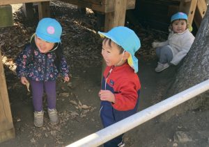 後半には、「石になっちゃった!」と言って固まってみたり、「お風呂を作ろう!」と落ち葉を集めたり、イメージを膨らませながら楽しみました♪