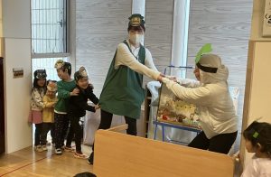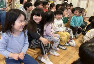 お誕生日会では、2月生まれのお友だちに、讃美歌『生まれる前から』を歌ってお誕生日をお祝いします。お祝いした後には、お誕生日のお友だちに質問をしました。幼児クラスのお友だちが質問しる姿をよく見て、聞いていました。お楽しみコーナーでは、『おおきなカブ』の劇を2月生まれのお友だちはお手伝いしながら、みんなで歌を歌ったり、「うんとこしょ、どっこいしょ!」と一緒にかぶを引っ張ったりして楽しみました♪