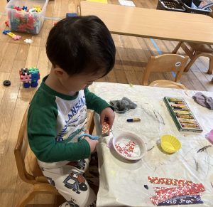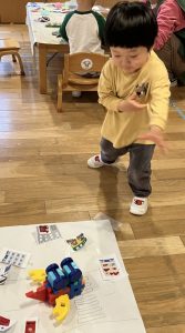 また、お部屋では、牛乳パックブロックで家や階段を作ったり、おままごとで赤ちゃんのお世話をしたり、井形ブロックで、街に車を走らせたりして遊びました♪
