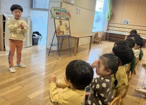 今日は二月生まれのお友だちのお誕生日会がありました。初めて二階のお部屋で、幼児クラスのお友だちと一緒にお誕生日会に参加しました。お誕生日会の前に、幼児クラスのお友だちが前でお手本をして、「グーチョキパーで何作ろう?」の手あそびをやりました。保育士ではなく、お兄さんお姉さんがやる手あそびに注目する子どもたち。良く見て真似をしながら楽しみました😊