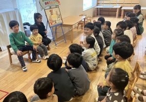 お誕生日会では、2月生まれのお友だちに、讃美歌『生まれる前から』を歌ってお誕生日をお祝いします。お祝いした後には、お誕生日のお友だちに質問をしました。幼児クラスのお友だちが質問しる姿をよく見て、聞いていました。お楽しみコーナーでは、『おおきなカブ』の劇を2月生まれのお友だちはお手伝いしながら、みんなで歌を歌ったり、「うんとこしょ、どっこいしょ!」と一緒にかぶを引っ張ったりして楽しみました♪