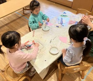 お誕生日会の後はお部屋でひな祭りに向けて製作を行いました。子どもたちにひな祭りについて伝え、お雛様とお内裏様の着物を千代紙を使って飾り付けます。好きな色の着物を選んで、ハサミで千代紙を切り、それをのりで貼って飾り付けました。よく手元を見て、集中して楽しむ姿がありました。