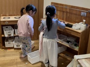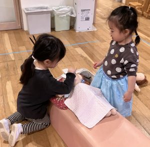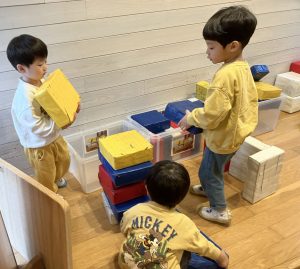 また、お部屋では、牛乳パックブロックで家や階段を作ったり、おままごとで赤ちゃんのお世話をしたり、井形ブロックで、街に車を走らせたりして遊びました♪