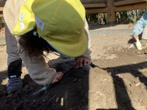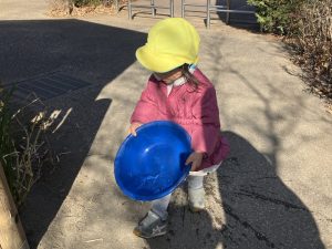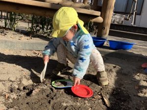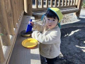 砂場ではいつも最初に水で砂を濡らしていろんな砂の感触を楽しめるようにしています。今日はみんなも水を運ぶことに挑戦。青いタライにほんの少し水を入れて持っていくお手伝いをしてもらいました。「ゆっくりゆっくりで大丈夫だよ」と伝えるとこぼれないように丁寧に運んでくれました✨ごはんづくりとお山づくりを楽しみました☺