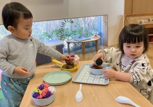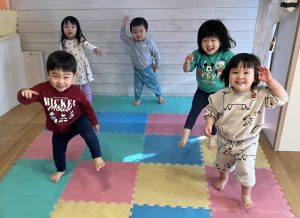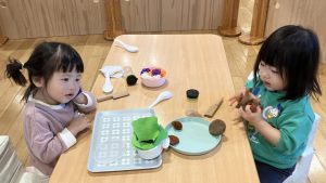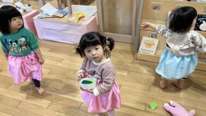 お部屋では元気にミッキー体操をしてからたんぽぽ組さんへ行き、おままごとを借りて遊びました。